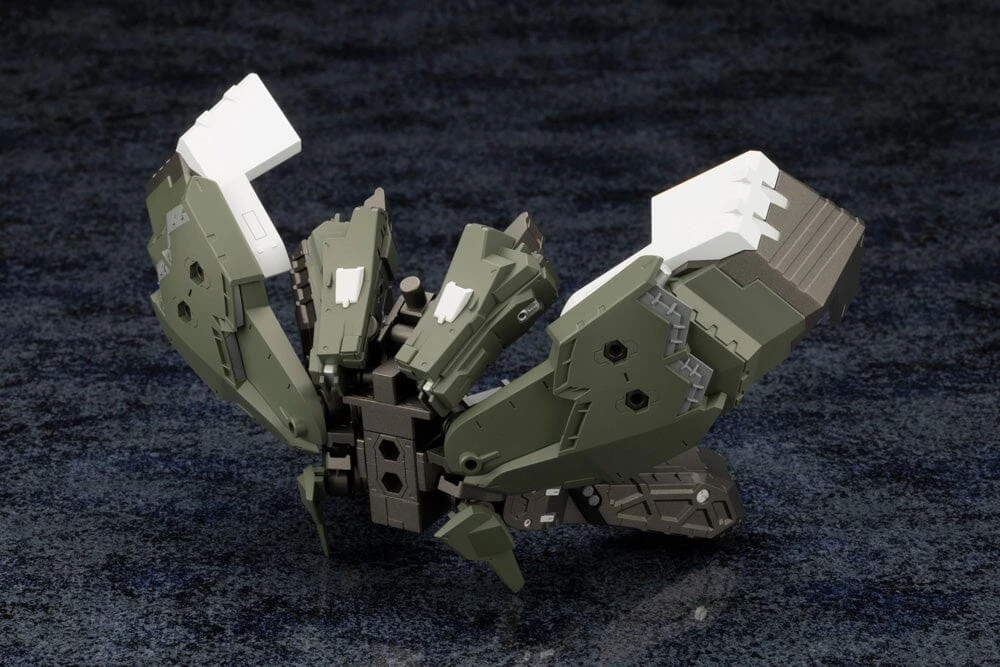 Includes a large booster compatible with all generations of HEXA GEAR. The booster features a number of articulated partsinside, allowing it to transform from a closed, armored state to a deployed state exposing the propulsion system inside. In its closed state, it can be held closed using the pins.