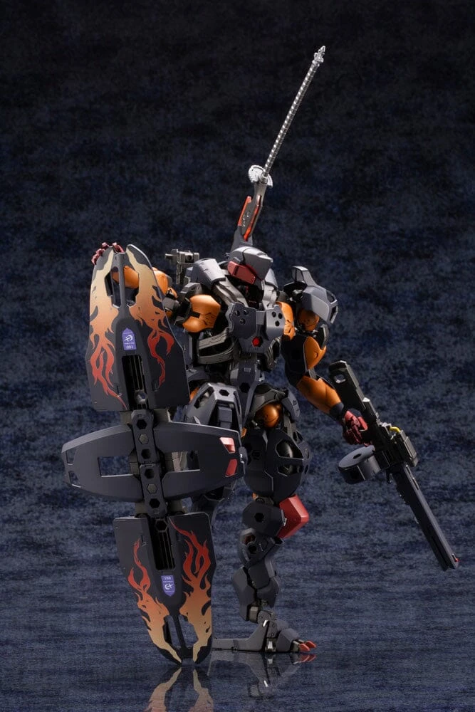 Standing at approximately 206 mm tall, the V-Thor Night Stalker humanoid HEXA GEAR boasts the widest range of motion in the series. The included HD Plasma Cannon can be attached to the mount on the back. The barrel can be replaced to change the cannon into a Gatling gun that fires solid bullets.The Exit Slider equipped on the waist can be removed and combined to make a large physical shield or a high-speed transportation board. Larger than the model itself, the Mega Charged Tactical Sword “Scarlet Blood” can be removed from its sheath. With a total length of 283 mm, this sword is currently the longest melee weapon in the HEXA GEAR series. This kit comes with a special ver. blade as a bonus part. Governors supported are: PAWN A1, PAWN X1, SENTINEL, WARMAGE, and EARLY GOVERNOR Vol. 1. Note that not all governors are supported. This kit includes special joints compatible with the Flying Base Neo (sold separately). The color scheme for this kit is black, gunmetal, metallic orange, red, silver, metallic red, clear red, and metallic clear red