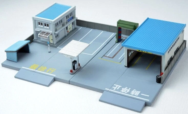 This is an N Gauge building or other structure. From Tomy Tech’s “Diorama Collection” comes this bus terminal set! Very realistic, and ready to add to your dioramas and 1/150 scale towns! Set includes one building, signboard, a wall and bench, two bases, and stickers.